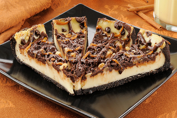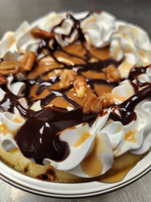 9″ Cheesecake with caramel, chocolate, pecans, Oreo crust, and whip cream topping.